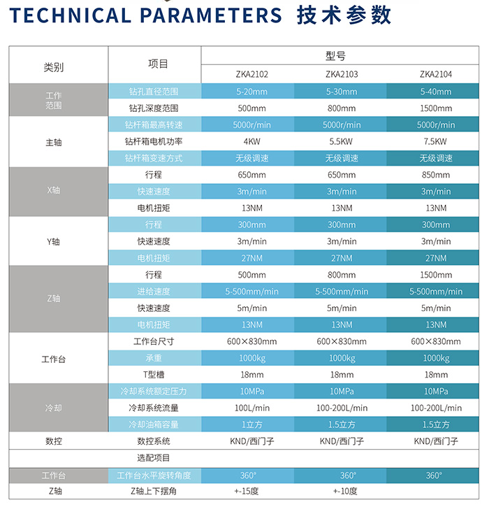 ZKA21系三坐标数控深孔钻机床采用枪钻加工方式(外排屑),刀具旋转进给,工件固定在工作台上,工作台可以垂直和横向移动;采用进口或国产的数控系统,具有单动和自动循环功能,三个伺服轴:X轴、Y轴、Z轴,采用伺服电机驱动滚珠丝杠副实现各轴的移动;刀具转速和进给量均为无级调速。最大钻孔直径是20mm、30mm、40mm三种规格。具有钻削直孔、斜孔、盲孔和阶梯孔的功能。广泛应用于汽车、摩托车行业、模具行业、军工行业、航天工业、液压阀体、齿轮轴类等零件的小深孔加工。